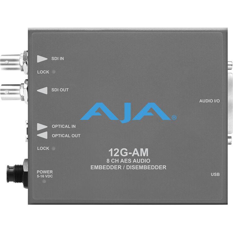 The AJA 12G-SDI 8-Channel AES Audio Embedder/Disembedder is a mini-converter with support for 12G-SDI input and output up to 4K/UltraHD. Fiber models offer single link fiber I/O including LC and ST options. AES Audio disembedding is always functional, providing four AES outputs. Audio embedding is user selectable, on a channel pair basis, to either pass 12G-SDI input audio or to embed input AES audio from the breakout cable. The 12G-AM automatically detects and configures the input video standard.