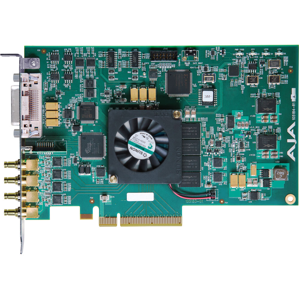 Using integrated hardware processing, the KONA 4 PCI-E Video I/O Card from AJA can ingest and output 4K resolution video at up to 60 fps. With that resolution, you can view the details of your production natively on a 4K monitor. Along with 4K resolutions, the KONA 4 supports uncompressed 1080p I/O with 4:4:4 or 4:2:2 color subsampling. The KONA 4 can simultaneously input and output uncompressed video via its 3G-SDI ports. Two ports accept the video input while the other two can drive a professional display or output to a recording deck.