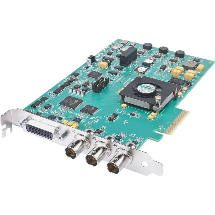 Capture sharp, high-definition video for broadcast, postproduction, or development with the KONA LHe Plus HD/SD PCIe Card from AJA. The PCIe card features one 1.5G-SDI BNC input and two 1.5G-SDI outputs that support up to 1080p30/720p60 video with eight channels of embedded audio. A breakout port requires an optional cable that provides reference, RS-422, 2-channel AES/EBU, analog composite/S-video/SD/HD component video, and 2-channel analog audio I/O.