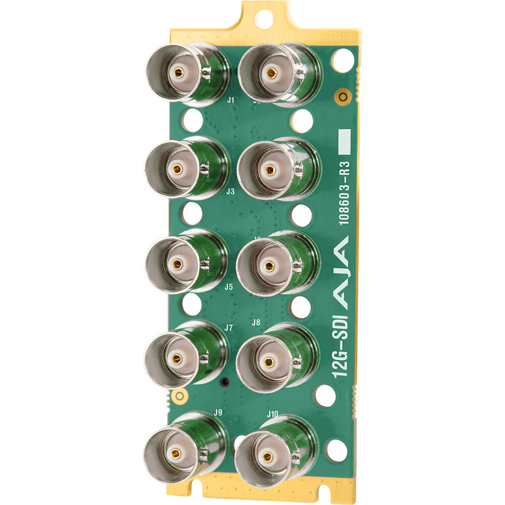 The OG-12GM 12G-SDI to/from SDI Muxer/Demuxer from AJA is an openGear card that provides 12G-SDI to quad-link 3G-SDI and quad-link 3G-SDI to 12G-SDI conversion for up to DCI 4K60 workflows. It supports both Square Division (Quadrant) and Two Sample Interleave (2SI) input and output and enables simple 60 fps to 59.94 fps and 59.94 fps to 60 fps frame rate conversion. This internal card is compatible with AJA OG-X-FR and OG-3-FR openGear frames.