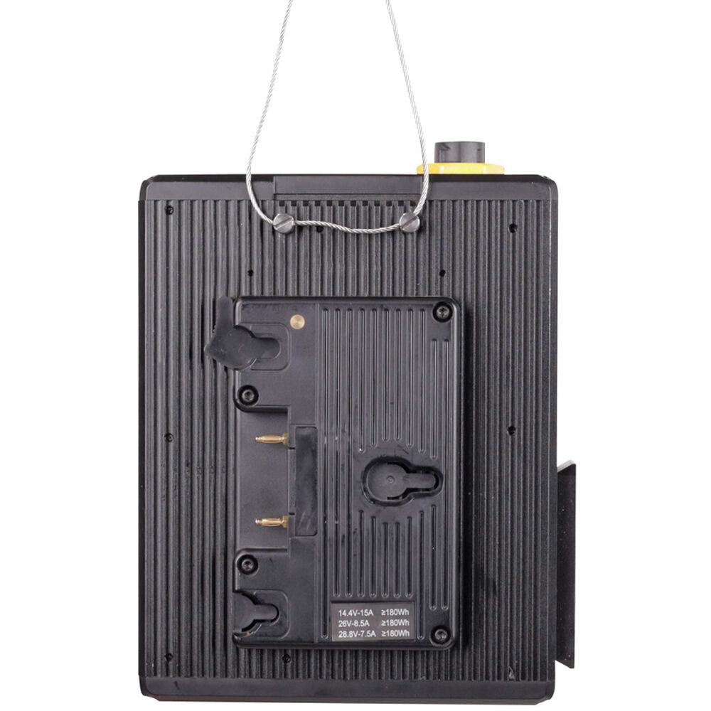 The control box is a multi-voltage AC power supply that features a Gold mount plate for use with compatible 14.4V, 26V, or 28.8V batteries. Full output can be achieved when using the AC power supply and using batteries allows the F22c to be used at either half or full power, depending on battery strength.