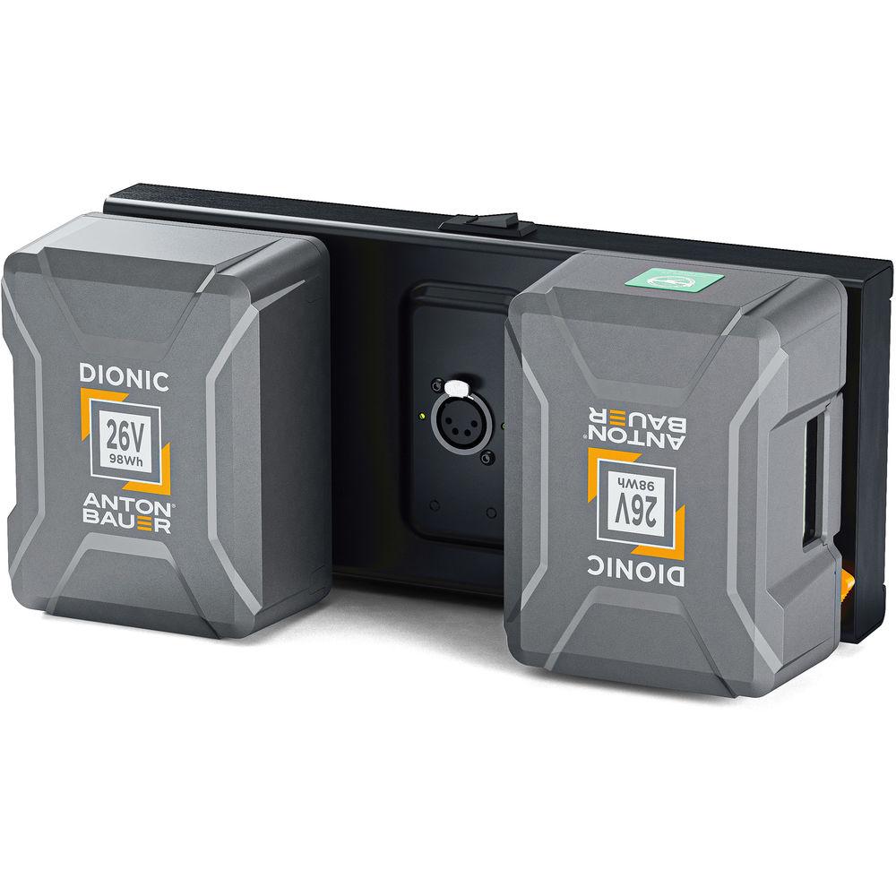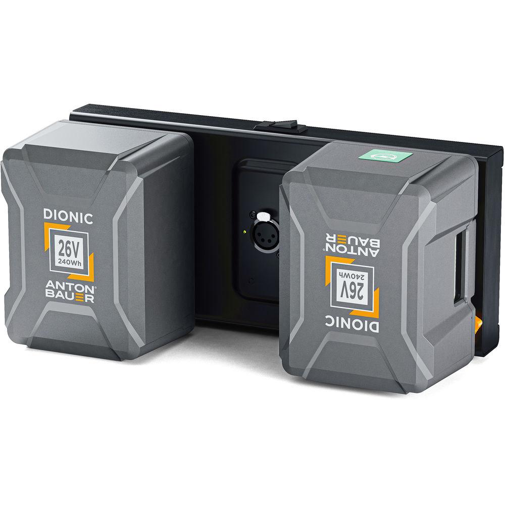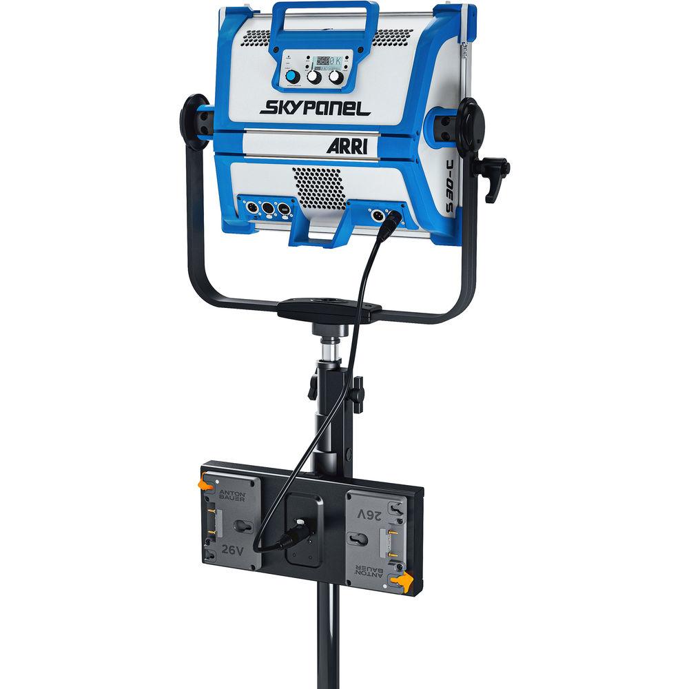 Use this 26V Dual Mounting Plate from Anton/Bauer to power the ARRI SkyPanel S-30C at 100% maximum or the S-60C at 50% via the XLR4 connector using two 26V Gold Mount Plus batteries. The dual mount supports two Dionic 98Wh batteries, and it also accepts Dionic 26V 240Wh Gold Mount Plus batteries that offer a faster, more accurate charge, even more accurate runtime data, and extended battery life.