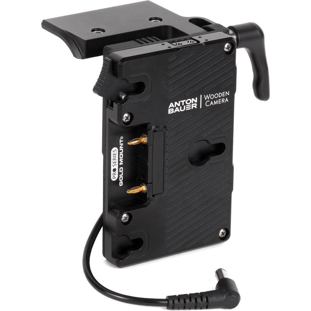 The Battery Slide Pro Gold Mount for Sony FX9 from Wooden Camera attaches to the rear of the camera and supports a Gold mount battery while leaving access to the camera's standard battery compartment. With the camera's BP-U35 battery in place, hot swapping is supported.