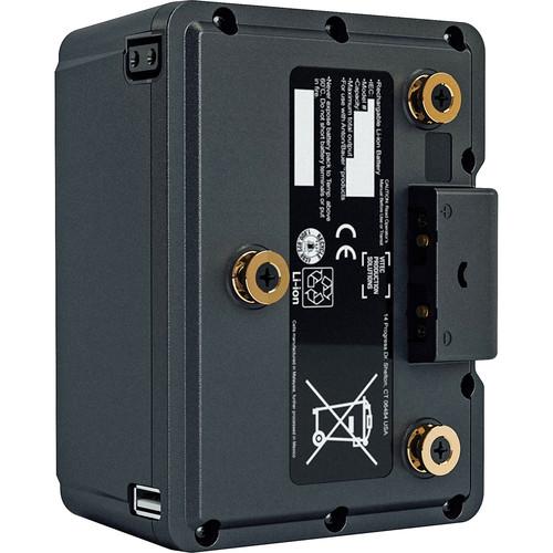 Providing a basic power readout and no user interactive surfaces, the Anton Bauer Titon 150 Gold Mount Lithium-Ion Battery can be used to power your Gold mount camera or other pro video gear. The lightweight lithium-ion chemistry can provide up to 10 amps of current on a continuous draw and support peaks of up to 12.5 amps for five seconds. At the side of the chassis, an LCD display screen shows battery capacity in percent remaining, and when put under load it shows the exact remaining runtime. Using the D-Tap and USB ports you can power essential accessories on your rig or other small electronics.