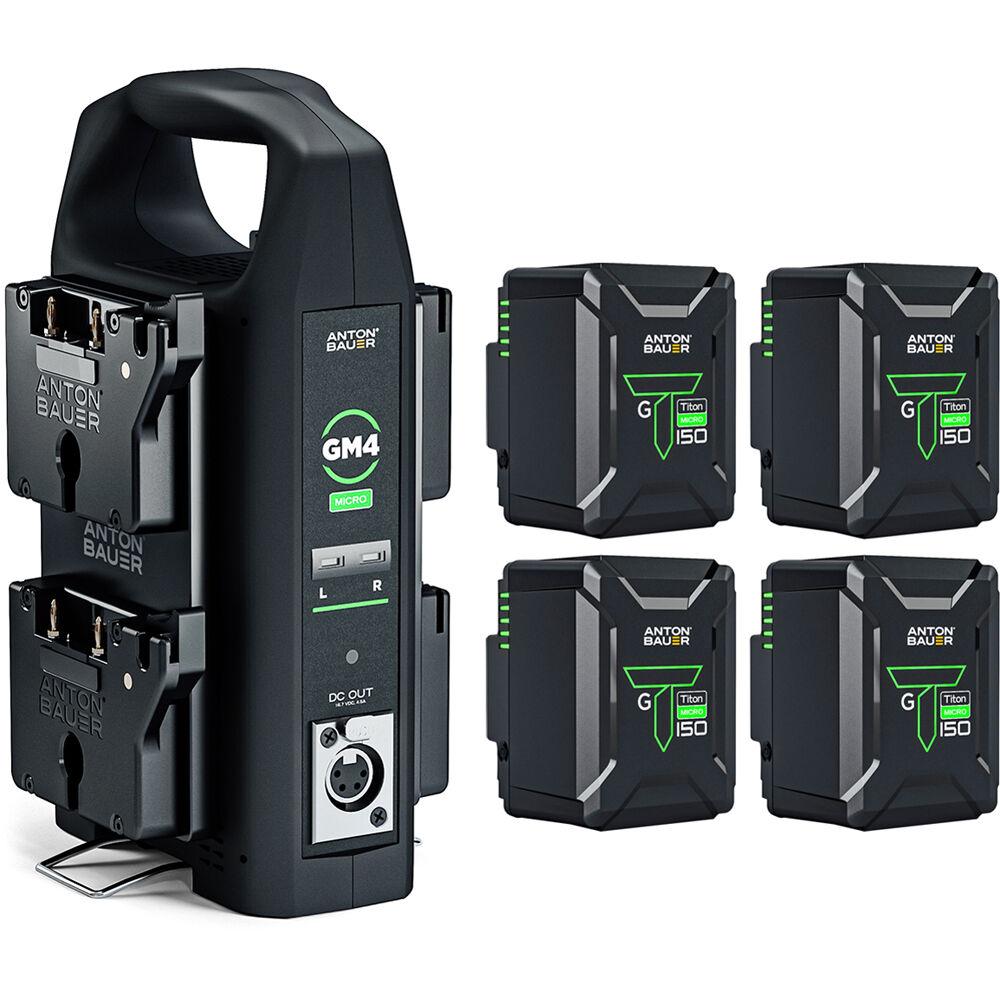 Power your camera and production gear all day using the Gold mount Titon Micro 150 4-Battery Kit put together by Anton/Bauer. This kit comprises four compact 140Wh Titon 150 lithium-ion batteries and a GM4 quad Gold mount charger. The lightweight Titon Micro 150 batteries feature a 10A continuous draw, an LCD capacity gauge, and both P-Tap and USB accessory ports. The GM4 quad charger features four Gold mount charging bays and a 4-pin XLR power output port.