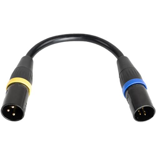 This 3-Pin Male to 4-Pin Male XLR Head Cable from Aputure is designed for the 2-Bay Battery Power Station. It is 7.9" long with a male 3-pin XLR connector on one end and a male 4-pin XLR connector on the other, both color-coded yellow and blue, respectively, so you can easily distinguish between them.