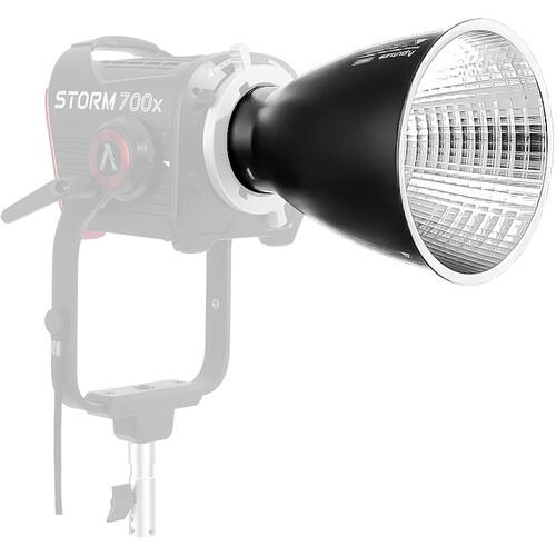 Designed for the separately available STORM 700x, the BM6825 Reflector from Aputure changes the native 58° beam angle of the fixture to a tighter 25° beam. This hyper-reflector increases the output of the fixture to 27,190 lux at 5600K, while ensuring a smooth falloff from the center to the edge. It works as an alternative to the 35° reflector that already comes with the STORM 700x.