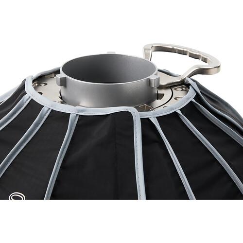 The Quick Dome 60 from Aputure is a circular Bowens mount softbox featuring a parabolic design that pairs with the STORM, Electro Storm, and Light Storm fixtures. The softbox has a reflective silver interior and provides a soft, even light output.