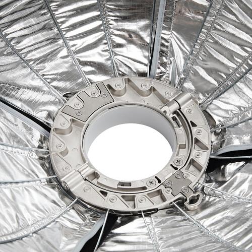 A quick release latch on the speed ring allows users to quickly set up the tension on all 16 steel support rods in seconds, making installation a breeze. The lateral side handle provides easy mounting setup and control and comfort when mounting. When not in use, the softbox folds down flat, making it easy to store in the included carry bag.
