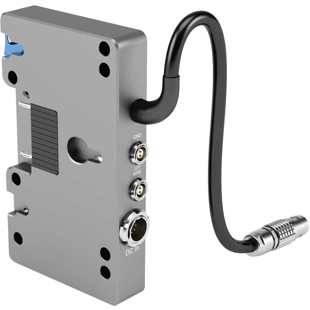Two 2-pin LEMO ports on the adapter output 13V regulated power for accessories. The Gold Mount Adapter Plate Mk II features a sturdy aluminum build.