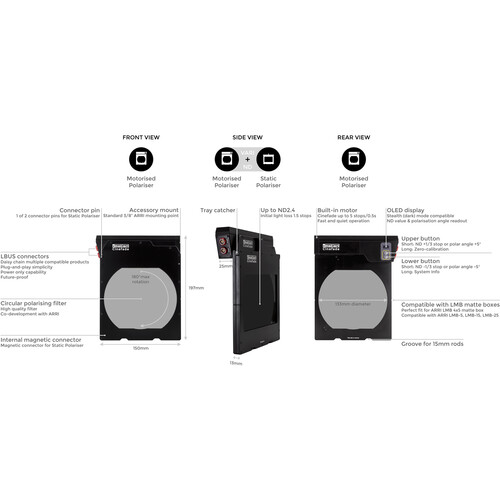 The cmotion Cinefade VariND from ARRI allows you to vary depth of field in one shot at constant exposure. It's compatible with any analog film or digital camera with a cine lens that has a manual geared aperture ring and accurate T-stop markings. It's also compatible with all ARRI MLB matte boxes. The VariND takes up two filter slots in VariND mode and one filter slot in RotaPola mode.