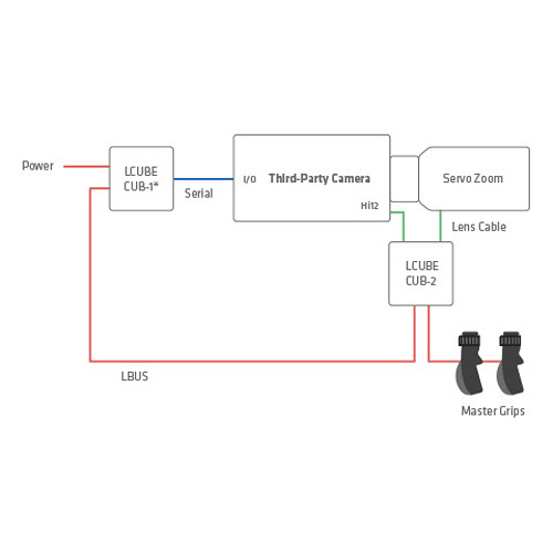 A pair of Master Grips provide full control of focus, iris, and zoom settings on cine-style lenses, and offer comfortable control of integrated servo motors on ENG- and EF-type lenses. Focus, iris, and zoom speeds are adjustable, and end limits can be set for easier single-user moves. Camera controls include the REC function and access to user buttons for both ARRI and third-party cameras. A separately available LCUBE CUB-1 is required for third-party camera control.