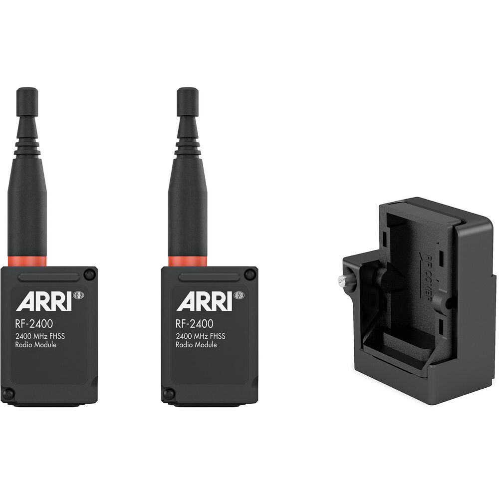 The TRINITY RF-2400 Radio Set from ARRI consists of one RAT-1 TRINITY radio adapter, two RF-2400 radio modules, and two ERM-2400 antennas. The included radio modules have 100 channels and use frequency-hopping spread spectrum (FHSS) technology to provide a long-range link in challenging RF environments.
