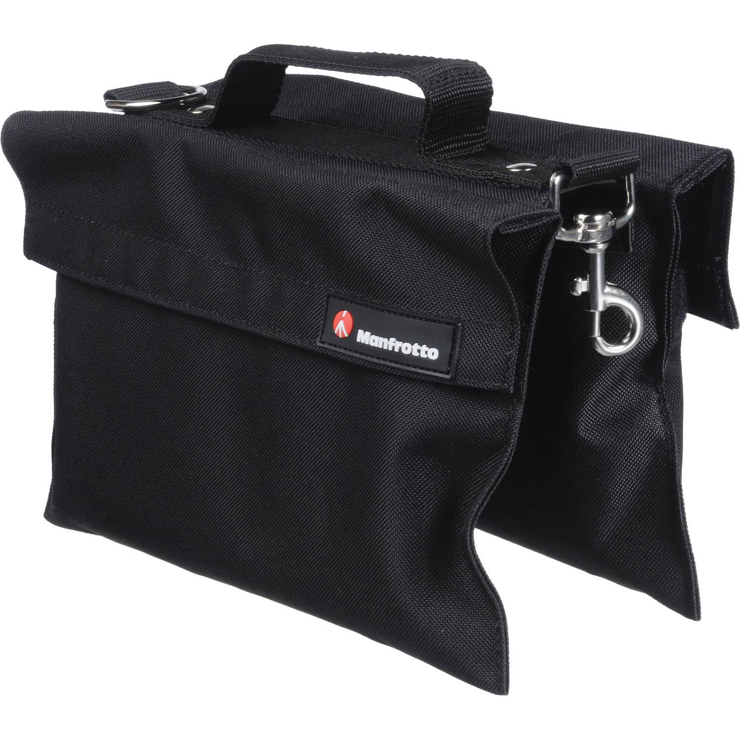 The Manfrotto G300 Sandbag is made of durable black nylon and features a saddlebag design that makes it easy to drape over stand legs or booms. The bag holds up to 75 lb of sand in its two compartments, has a touch fastener closure, and ships empty to allow you to fill it with any weighted material of choice. The bag has a D-ring at each end for use with a hook.