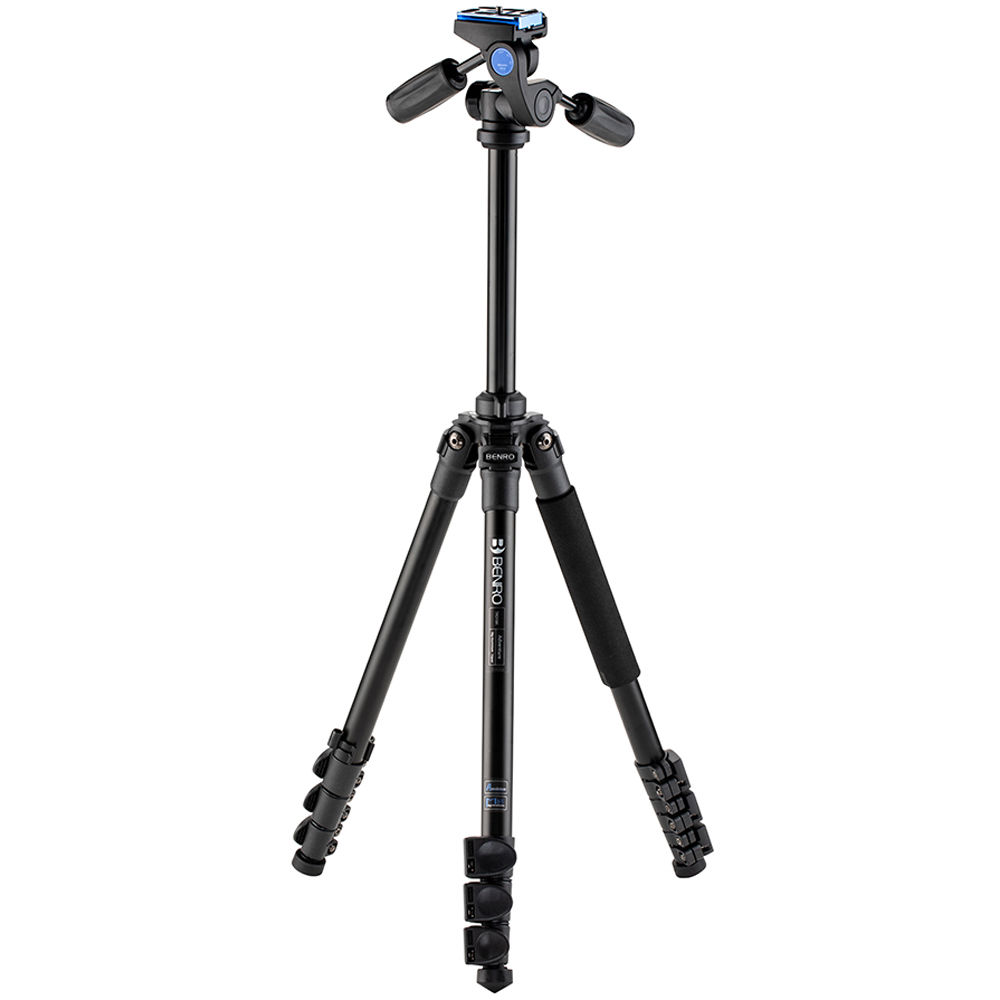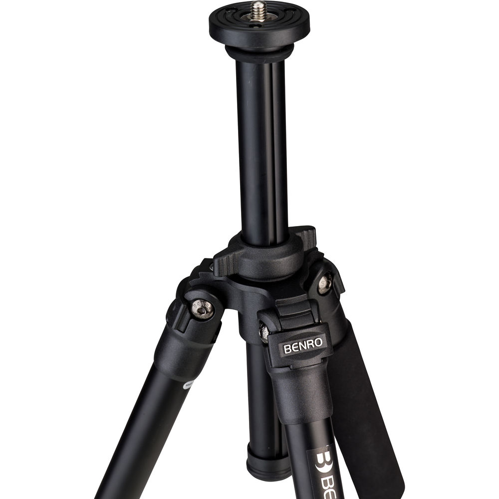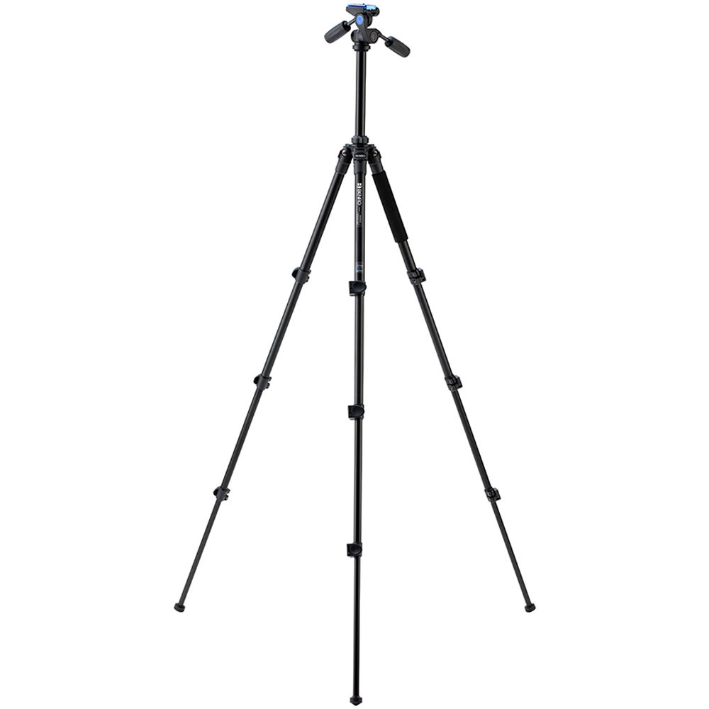 The 4.3 lb Adventure Aluminum Tripod with HD1A Pan and Tilt Head from Benro is an all-purpose four-section support with flip leg locks that open, so you can extend the legs along with the rapid center column to a maximum height of 60.4". The tripod's legs splay out to a second lower position of 15.7" for macro or close-up photography.