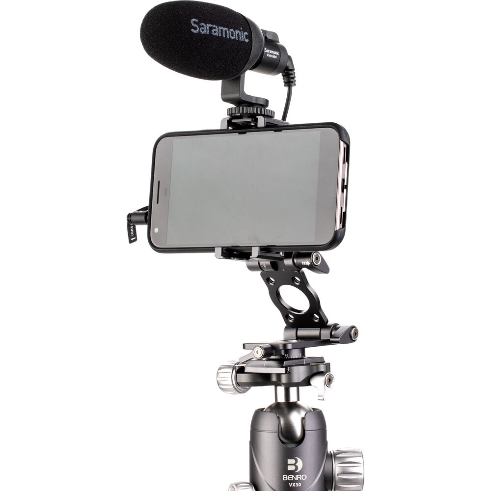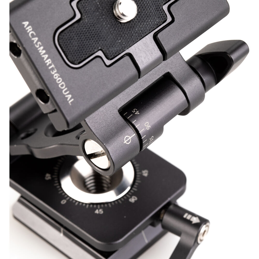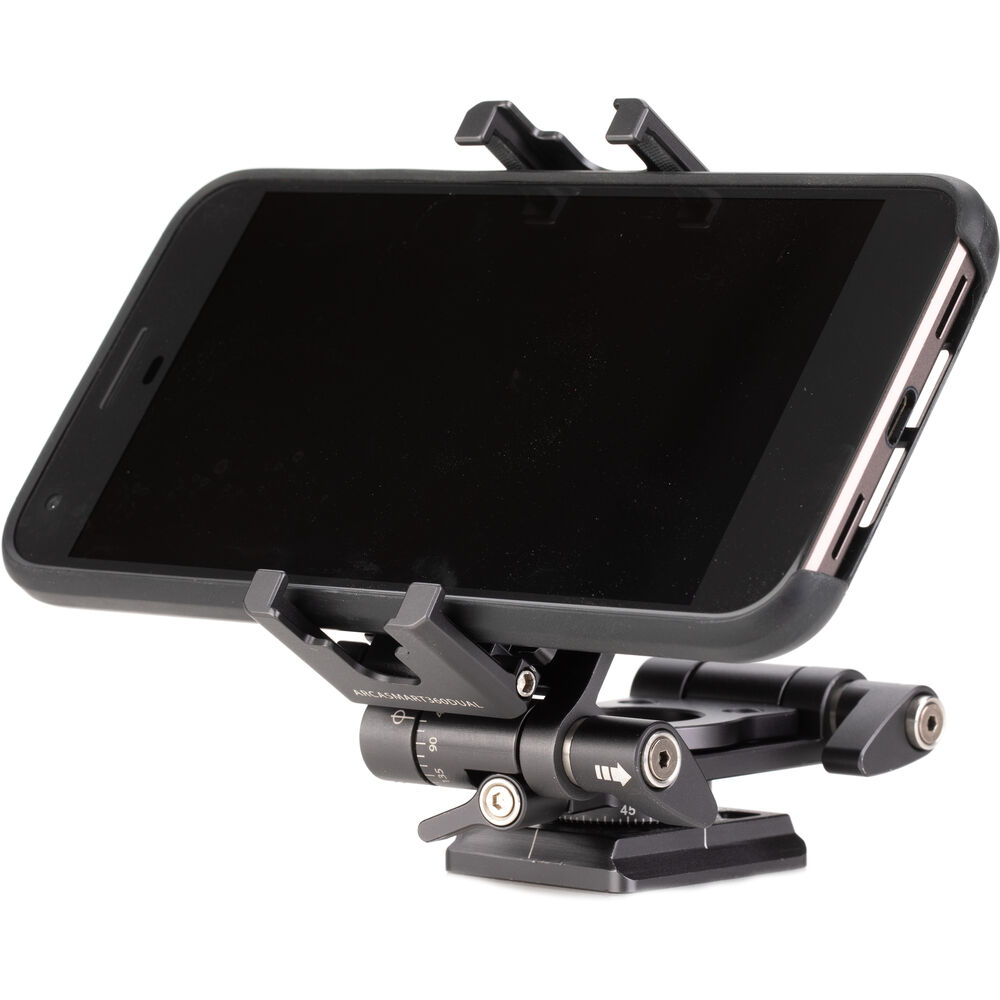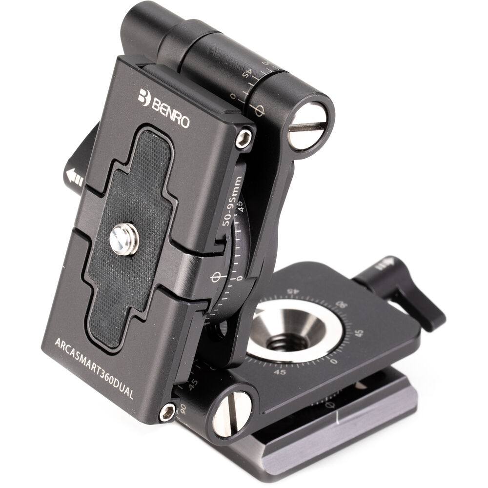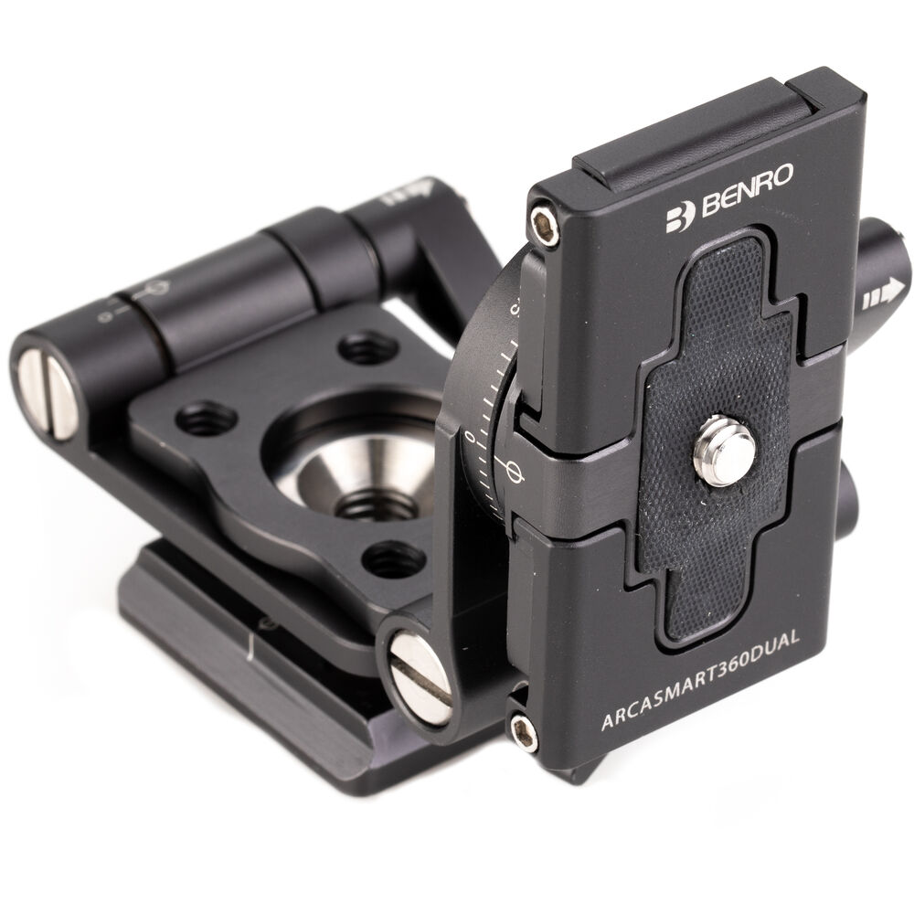 The Benro's ArcaSmart 360 Dual Plate is an innovative quick release plate that features multi-angle functionality and a uniquely designed phone holder that allows you to adjust your camera or phone to a variety of positions that are perfect for your shot. Compatible with mobile devices as well as DSLR and mirrorless cameras, this meticulously designed plate lets you switch from landscape to portrait orientation by simply unlocking the knob and rotating. This head also provides a full 360° panning range to any tripod or monopod that it's attached to, which is made even more convenient by the 3/8"-16 threads in the base.