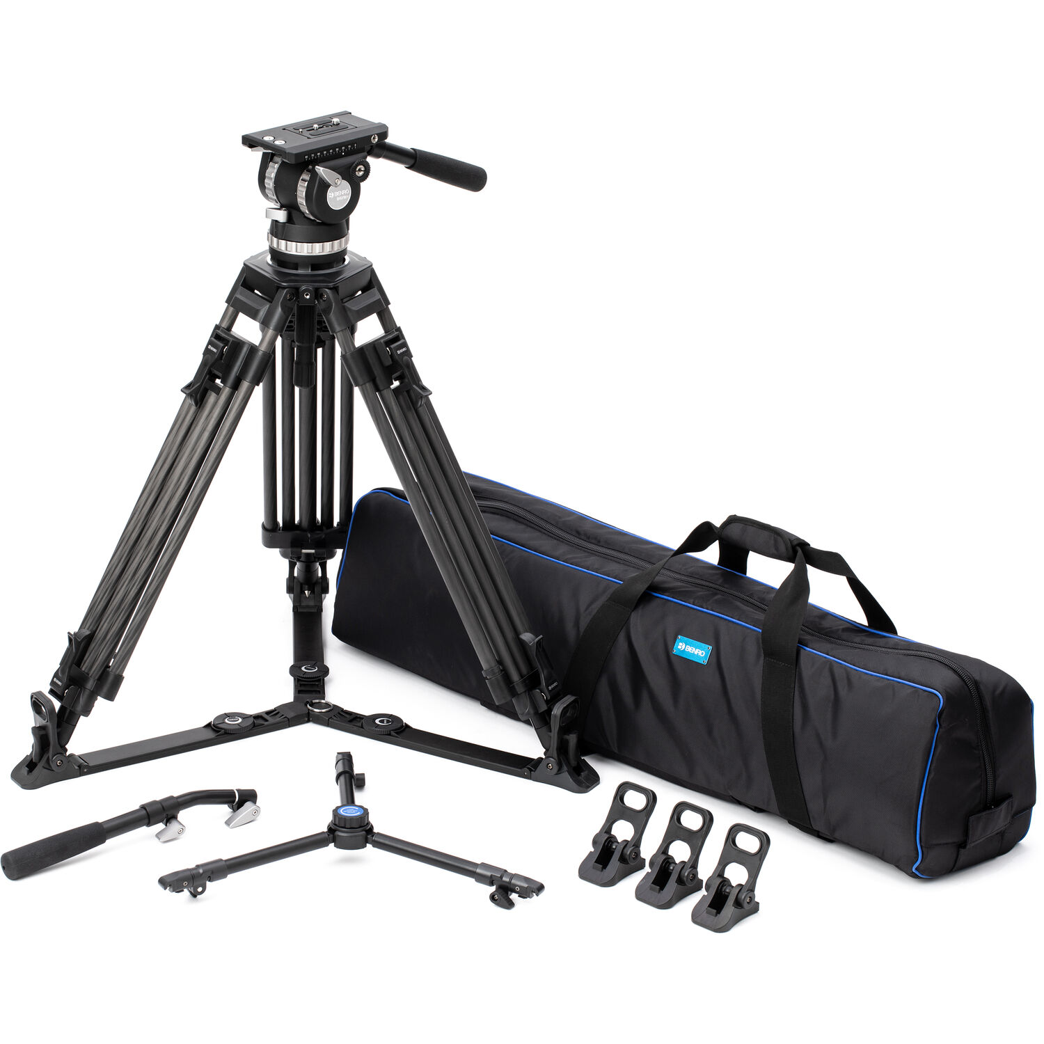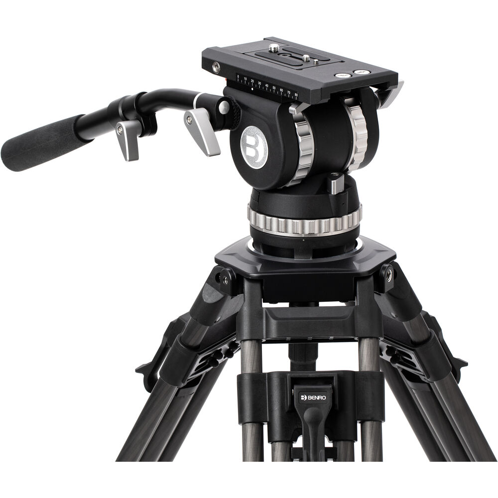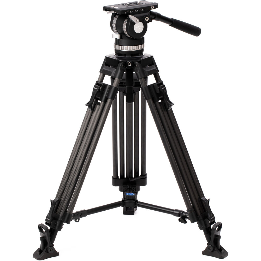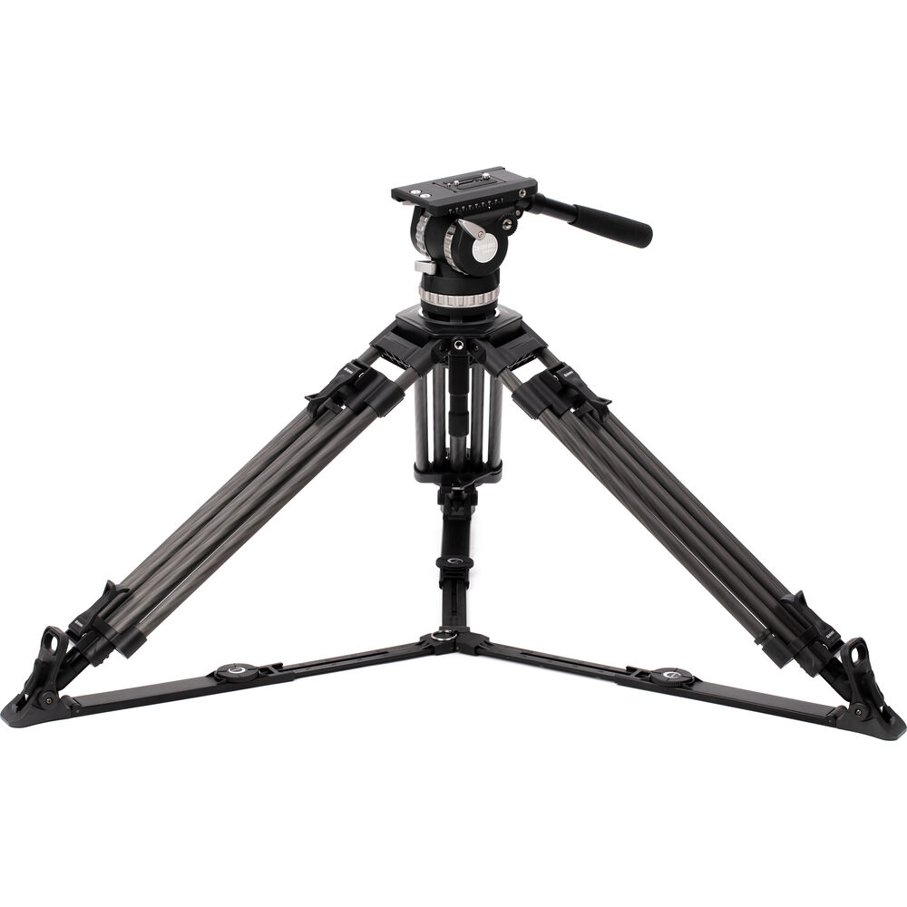 A 100mm built-in bowl head has dual removable telescoping pan arms, and a quick release camera plate allows the easy mounting and removal of your rig. Balancing the plate is intuitive with locking mechanisms and a 10-step counterbalance. Included with the system is a carry case to hold everything, along with the additional handle, middle spreader, and removable feet. Its carbon fiber construction ensures a durable construction.