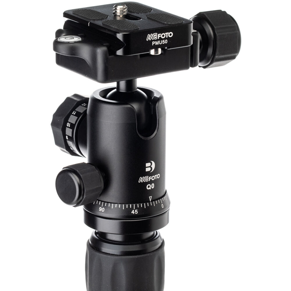 The Q0 ball head offers separate head and pan locks, a 360° pan index, and an integral bubble level. An Arca-type quick release plate with a 1/4"-20 camera screw is included in the kit, along with a durable carrying case with a shoulder strap for storage and transport.