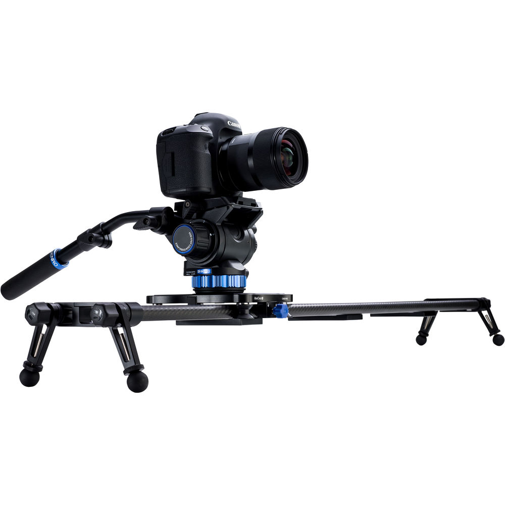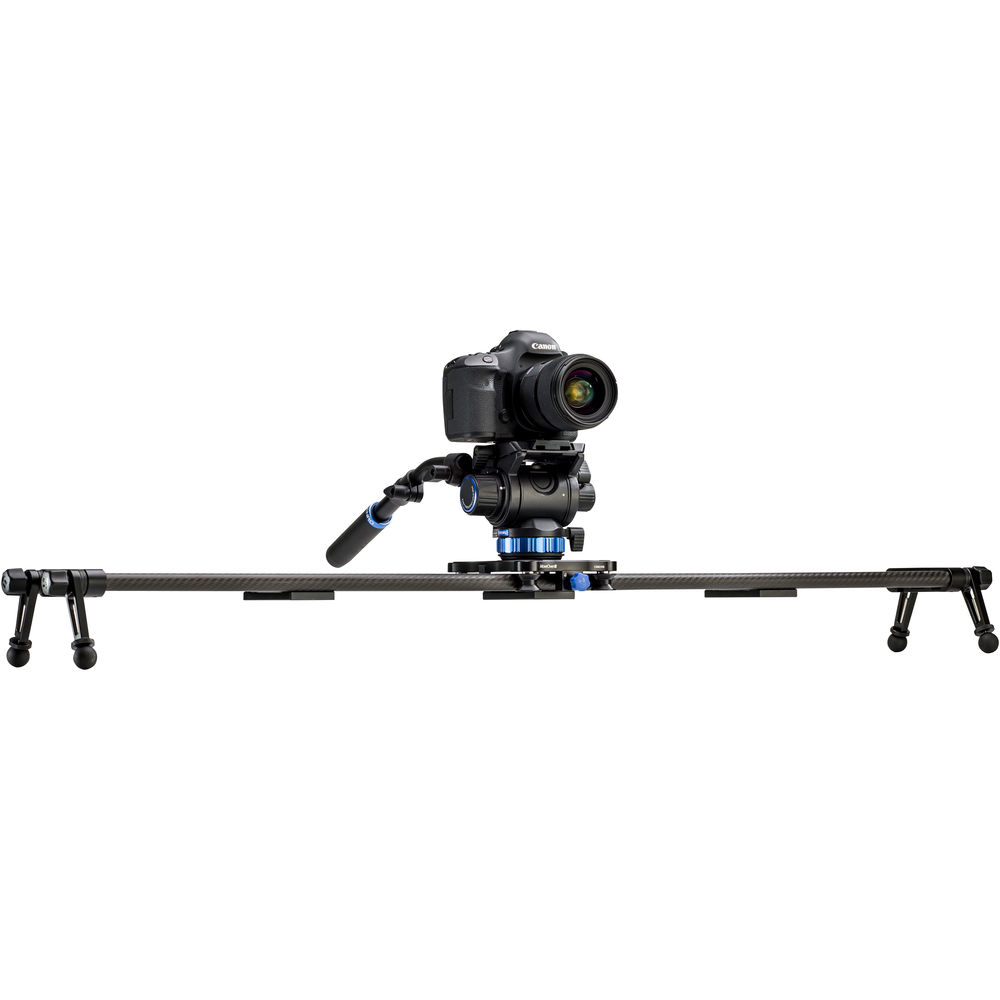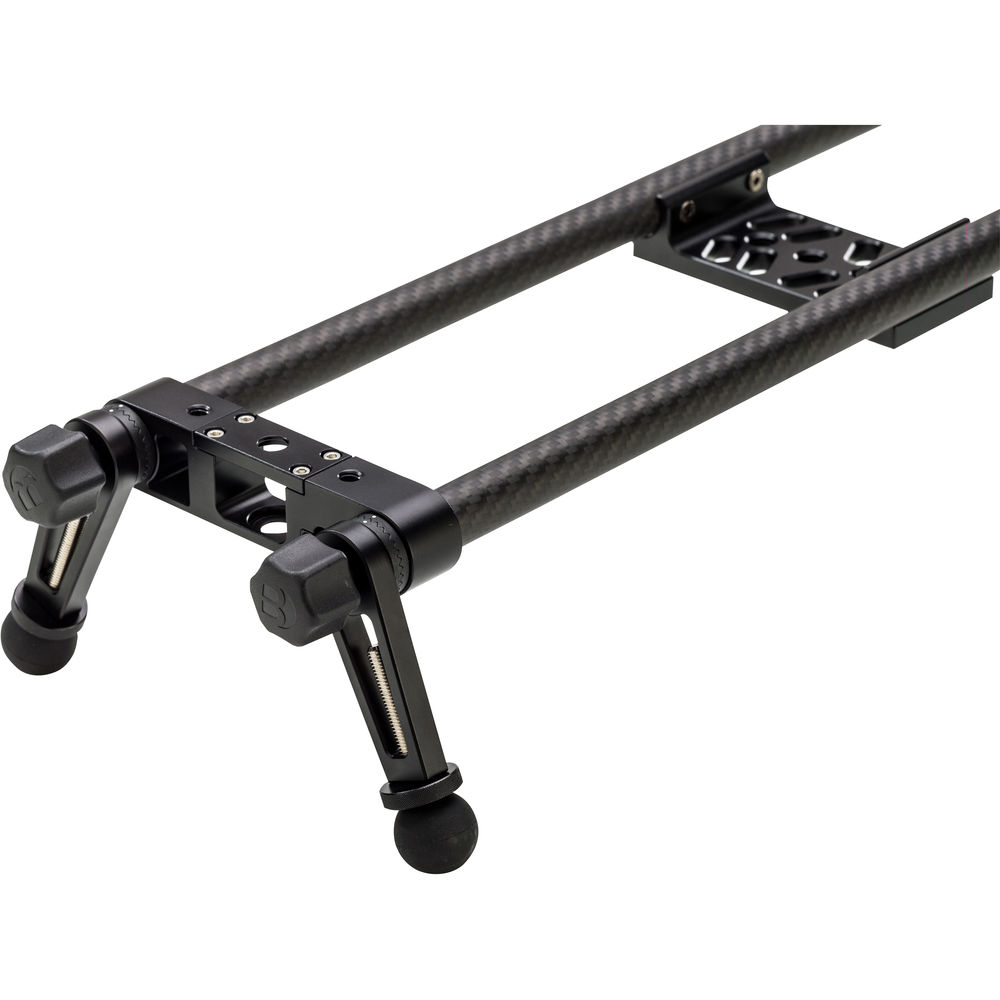 The slider features 18mm diameter carbon fiber rails and supports a total payload of up to 17.6 pounds. The slider can be mounted on a tripod or stands, or placed on a level surface. The built-in bubble level enables you to confirm that your slider is level. Each leg mounts onto the slider track ends via a rosette and can rotate throughout 360°, and each foot has approximately 4" of height adjustment for leveling. You can operate the slider on any angle from 0 to 90°, and you can even undersling the slider.