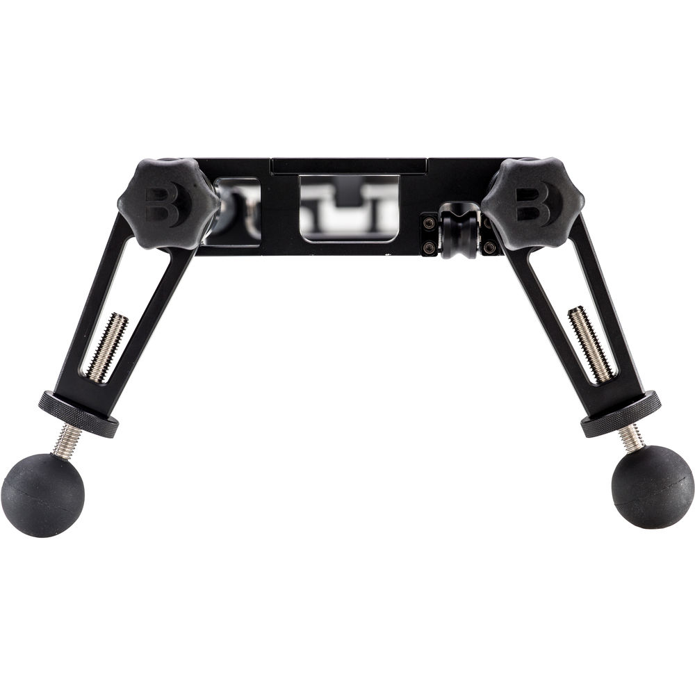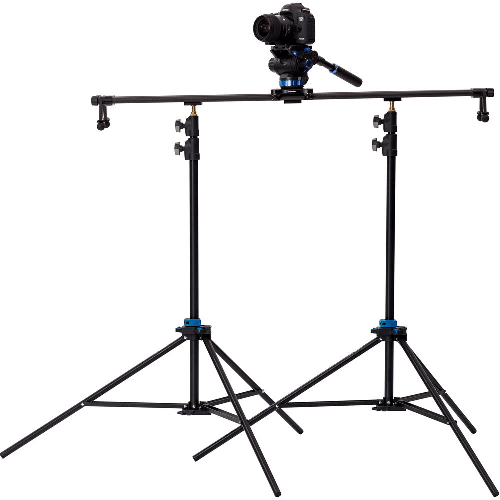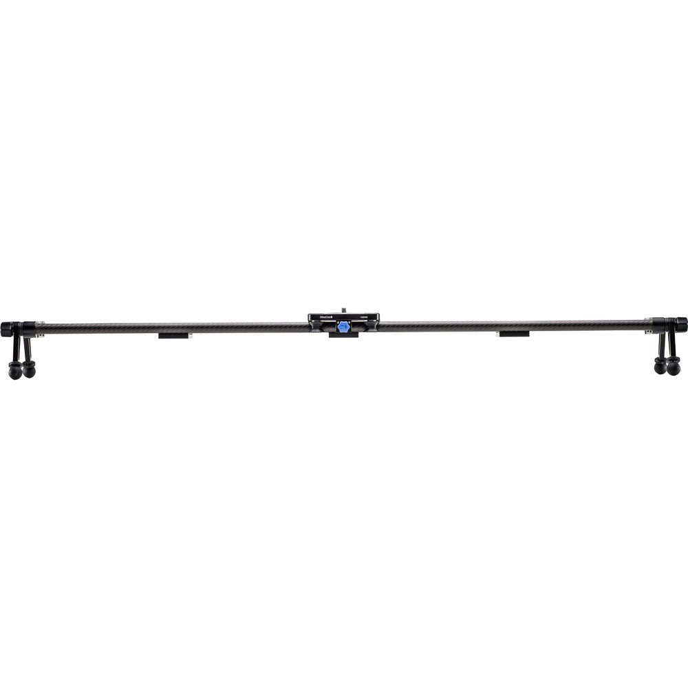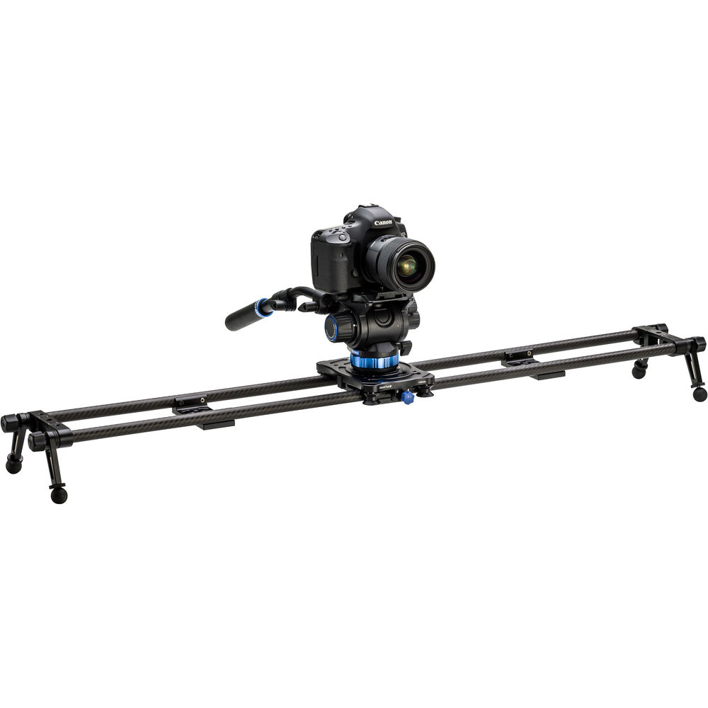 The slider features 18mm diameter carbon fiber rails and supports a total payload of up to 17.6 pounds. The slider can be mounted on a tripod or stands, or placed on a level surface. The built-in bubble level enables you to confirm that your slider is level. Each leg mounts onto the slider track ends via a rosette and can rotate throughout 360°, and each foot has approximately 4" of height adjustment for leveling. You can operate the slider on any angle from 0 to 90°, and you can even undersling the slider.