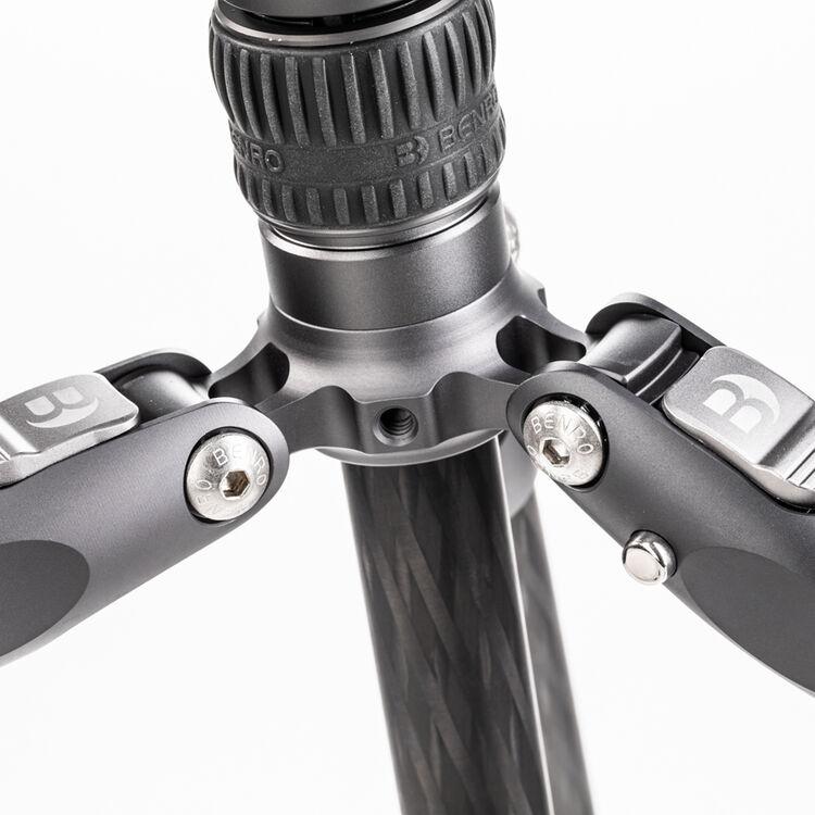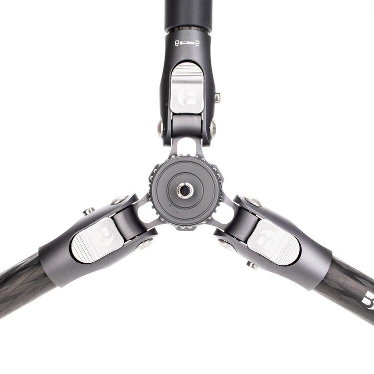 The Rhino One Series Carbon Fiber Tripod from Benro has a maximum height of 65.2", a load capacity of 35.2 pounds, and is compatible with any type of ball head, gimbal, or pan/tilt head. The reverse-folding design allows the tripod to fold down to a compact 24.4" for easy storage or transport. Each leg features an automatic leg angle adjustment button that makes it easy to adjust leg angles for low-level positioning or leveling on uneven terrain. The center column and one leg can be removed and combined into a 67.3" tall monopod for shooting conditions where a tripod may be too bulky or slow, as when shooting sports or wildlife. Each leg has a rubber foot and an interchangeable steel spike for traction on all kinds of surfaces.