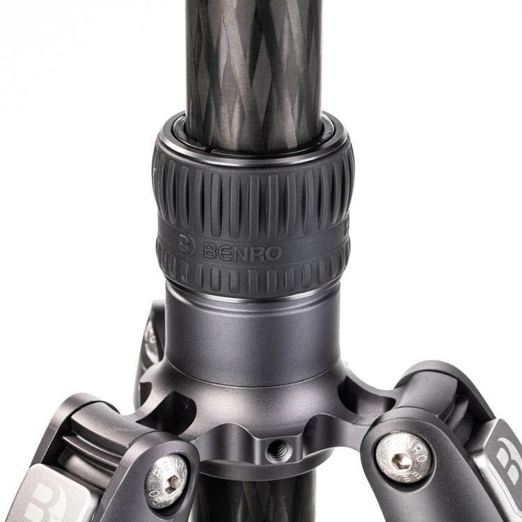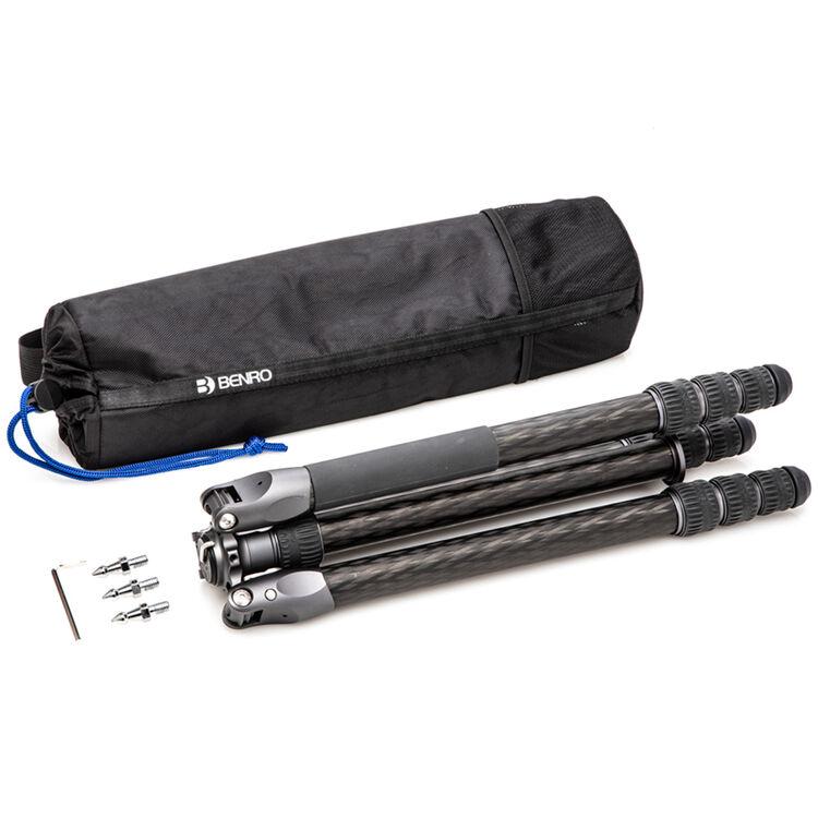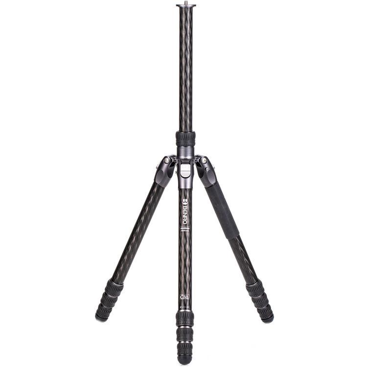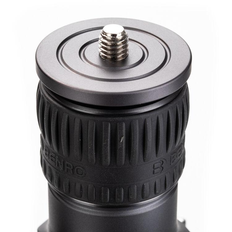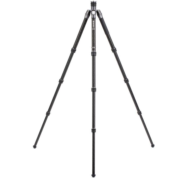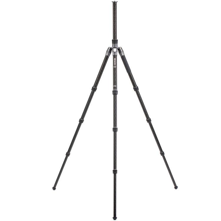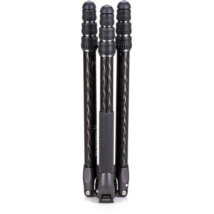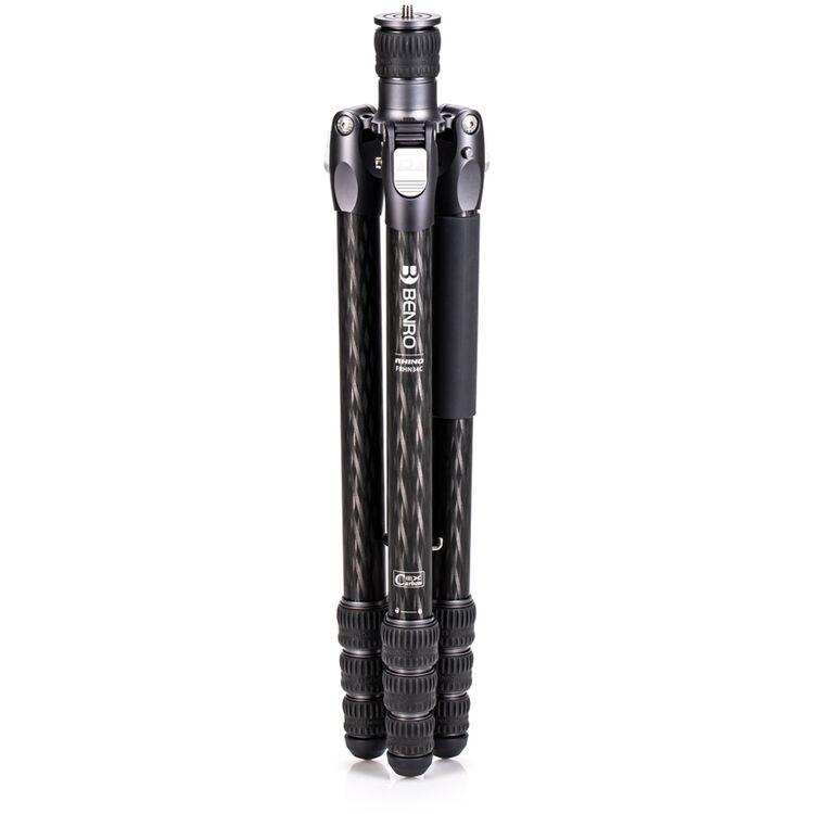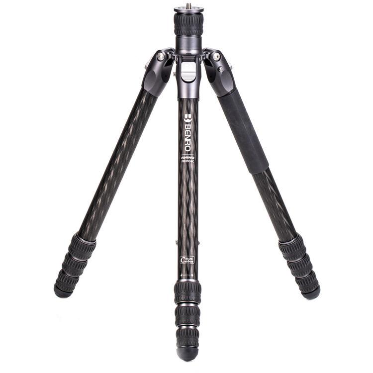 The Rhino Three Series Carbon Fiber Tripod from Benro has a maximum height of 68.8", a load capacity of 44 pounds, and is compatible with any type of ball head, gimbal, or pan/tilt head. The reverse-folding design allows the tripod to fold down to a compact 25.9" for easy storage or transport. Each leg features an automatic leg angle adjustment button that makes it easy to adjust leg angles for low-level positioning or leveling on uneven terrain. The center column and one leg can be removed and combined into a 71.4" tall monopod for shooting conditions where a tripod may be too bulky or slow, as when shooting sports or wildlife. Each leg has a rubber foot and an interchangeable steel spike for traction on all kinds of surfaces.
