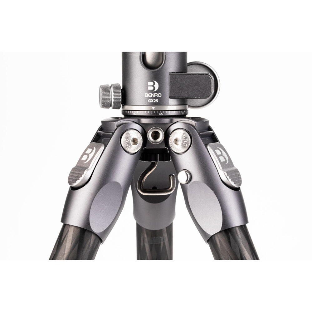 The small yet mighty Tortoise Columnless Carbon Fiber One Series Tripod with GX25 Ball Head from Benro is a compact, lightweight travel tripod with a high load capacity and remarkable stability. The center column-free design makes it nimble and lightweight for travel and reduces the potential for shake common to high center column positioning. This is especially significant when shooting video content. The legs offer independent spread and three locking positions and incorporate automatic leg angle adjustment for fast and sure setup. The aluminum leg spider features a 1/4"-20 accessory mounts for extension arms, monitors, lights, and more. The rubber feet feature three distinct contact surface providing a grip whether the legs are vertical, on an angle, or nearly horizontal when positioned.
