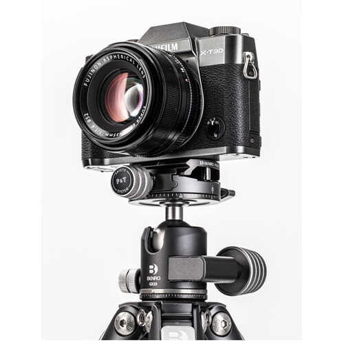 The GX25 ball head is a low-profile head featuring dual panoramic mode, which allows panning head from its base and also from the quick release platform. The controls are simple, with ball friction adjustment built into the main lock knob, plus an independent pan lock. It includes a PU56 quick release plate and features a quick release plate safety lock.
