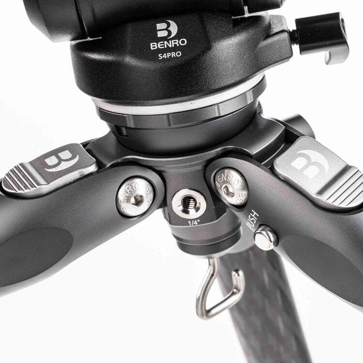 The Tortoise 3 Columnless Carbon Fiber Tripod with Leveling Base from Benro is a portable, travel-friendly tripod leg set that supports loads up to 44.1 lb and has a working height range of 9.3 to 64.4". The carbon fiber legs utilize twist-lock joints for fast and secure setup. This tripod features a head-leveling base for quickly achieving camera alignment with the horizon. The head fitting on the legs incorporates a 1/4"-20 accessory mounting port, allowing a variety of accessories to be attached. The tripod features independent leg spread with three locking angles and a push-button locking system. The rubber feet provide a grip whether the legs are vertical, on an angle, or nearly horizontal when positioned. The rubber feet can be replaced with the included spiked feet for use on slick surfaces.