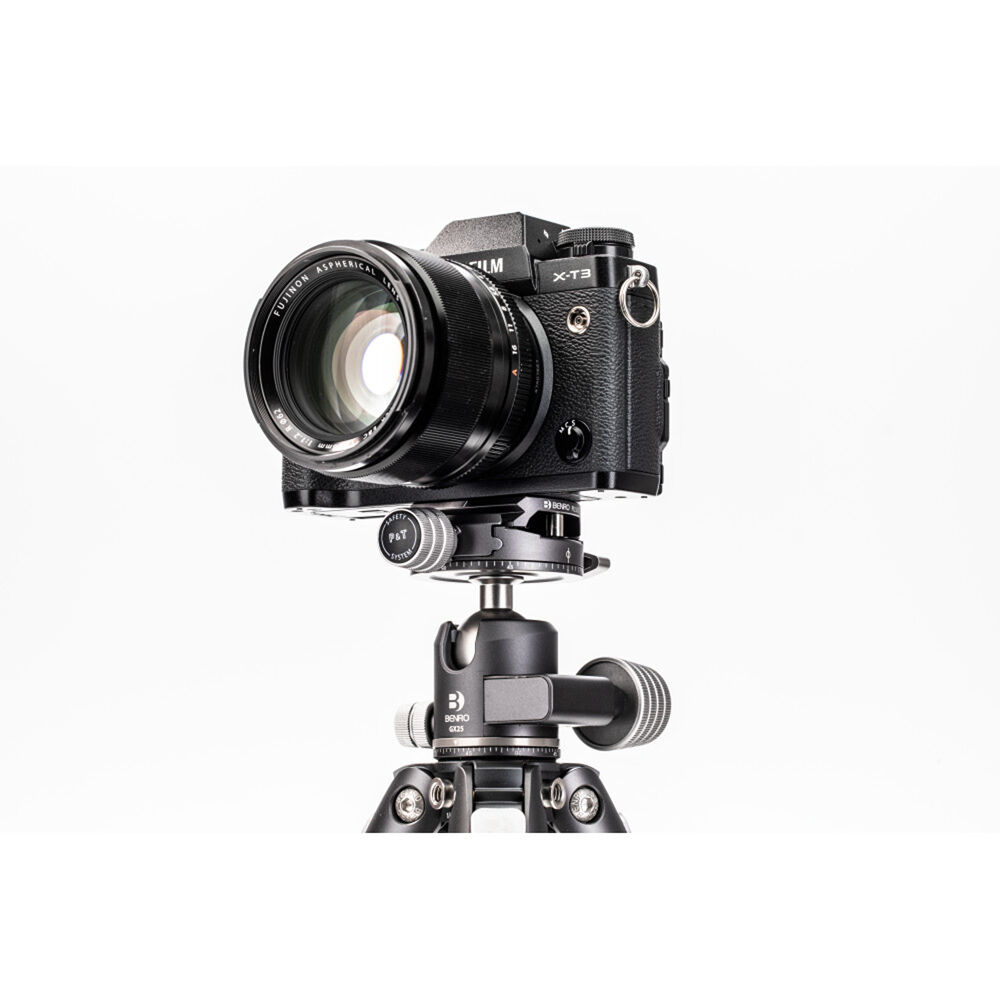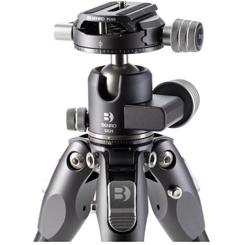 The GX25 ball head is a low-profile head featuring dual panoramic mode, which allows panning head from its base and also from the quick release platform. The controls are simple, with ball friction adjustment built into the main lock knob, plus an independent pan lock. It includes a PU56 quick release plate and features a quick release plate safety lock.