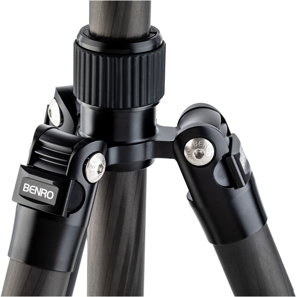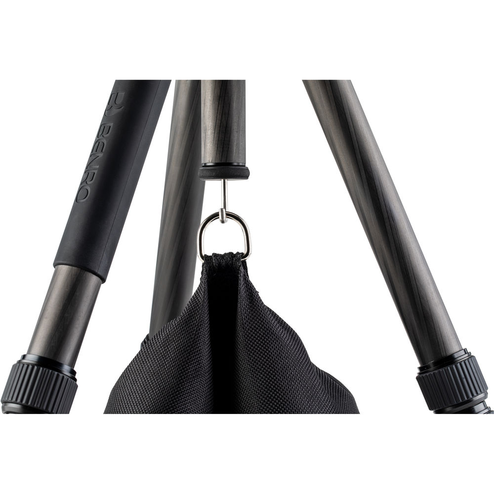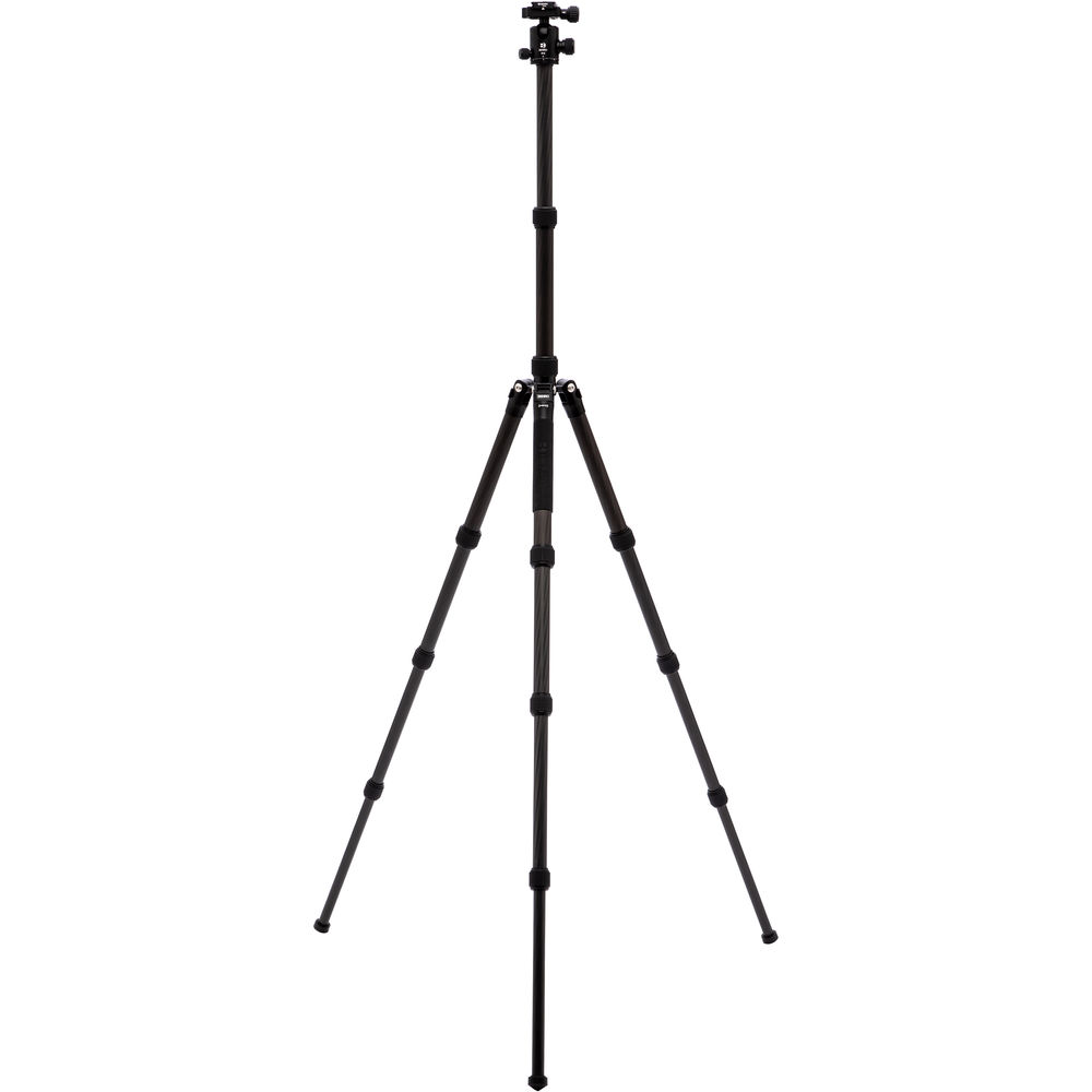 The black 2 Series Tripster Travel Tripod from Benro is a four-section carbon fiber tripod with a two-section center column that combine to reach a maximum height of 61.4", while weighing 3.5 lb. Splaying the legs completely out, the support drops to a minimum height of 15.6". Moreover, the legs fold in the reverse to a compact 15.7", so you can carry it to the next location. The removable center column and one leg can combine to create a monopod with a maximum height of 64.2". The Arca-type compatible ball head has a load capacity of 26 lb and includes a quick release plate with a 1/4"-20 camera mounting thread. Additionally, a 1/4"-20 socket located on the yoke of the tripod is used to attach other accessories that would aid you in creating a photograph.
