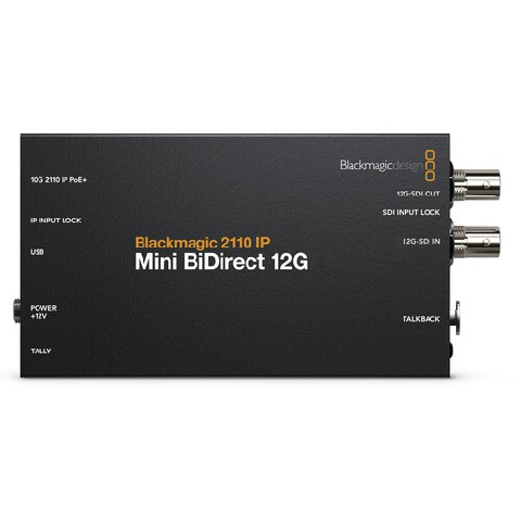 Connect your 12G-SDI broadcast studio camera to SMPTE-2110 IP systems with this 2110 IP Mini BiDirect 12G Converter from Blackmagic Design. The converter allows you to send up to UHD 4K 12G-SDI camera video and program return using the same converter, and it is so compact that it can easily mount onto your camera rig. The converter also features a 5-pin XLR talkback headset and a press-to-talk button to keep communication between camera operators and the broadcast production booth.