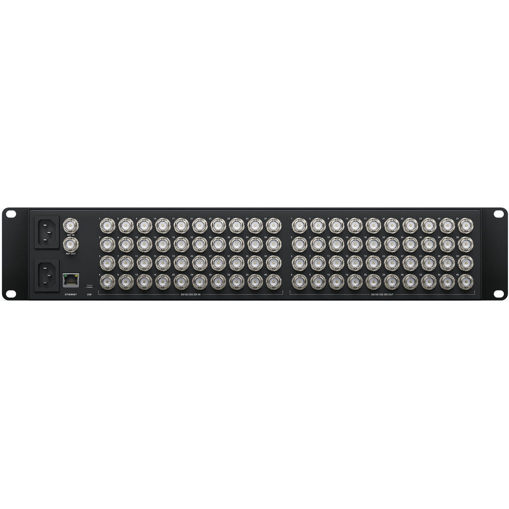 Support a mix of multiple video formats using the Videohub 40x40 12G Zero-Latency Video Router from Blackmagic Design. This advanced router provides 40 12G-SDI inputs and 40 12G-SDI outputs for routing any combination of SD, HD, UHD 4K, and DCI 4K video. The Videohub 40x40 12G centralizes all your SDI cables in one hub, enabling you to connect any video input to any video output, or even a single video input to multiple video outputs while eliminating clusters of cables and the need for complex diagrams. This versatile unit can be used with multiple HyperDeck recorders for redundant mastering, to route video to multiple streaming processors for all your broadcast platforms, or to add extra inputs to an ATEM switcher.