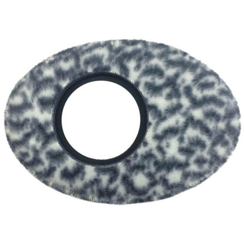 The Oval Extra-Large Viewfinder Eyecushion in snow leopard fleece, from Bluestar, features outside dimensions of 5.1 x 3.6" to securely fit over many common external and built-in viewfinders. These include the Alphatron, the Kamerar QV-1, VF-4, and VF-4+ EVFs, the MagView 3:2, 4:3, and 16:9 EVFs, those of the Canon C100, C200, C300, C500, XF300, XF305, and XF205 HD cameras, the EVFs of the Sony FS5, HVR-S270, HXR-NX100, and PXW-Z150 cameras, and many more. This fleece version is made of 100% synthetic material and provides a high level of softness and comfort for cold weather while enhancing light blockage. The fluffy feel reduces the rate of heat transfer, making the material feel warmer in cold conditions.