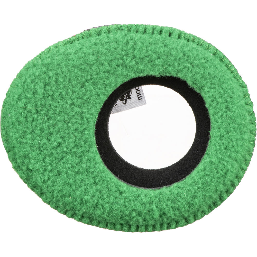 The Oval Ultra Small Viewfinder Eyecushion in green fleece, from Bluestar, features outside dimensions of 3.3 x 2.6" to securely fit over many common external and built-in viewfinders. These include the Hoodman Hoodeye, JJC Oval Shape EyeShade, JJC Viewfinder, Bolex H16, and the viewfinder of the Panasonic GH5 with a compatible oval eyecup similar to the Hoodeye. This fleece version is made of 100% synthetic material and provides a high level of softness and comfort for cold weather while enhancing light blockage. The fluffy feel reduces the rate of heat transfer, making the material feel warmer in cold conditions.