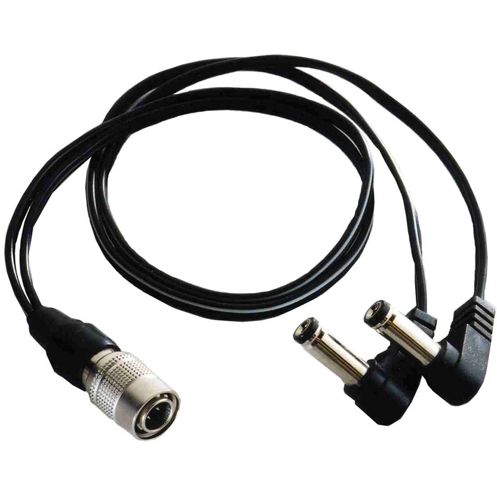 The BB-BAG-24/2 from Cable Techniques is a DC power cable designed for use with Lectrosonics receivers and ISO9VOLT/SMBATELIM battery eliminators. The cable is 24" long and has a Hirose connector on one end and a pair of right-angle single-conductor DC plugs on the other.