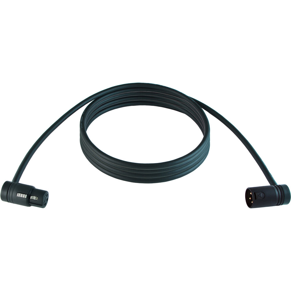 The 25' cable is terminated with a low-profile, right-angle XLR-3 female connector (with a black cap) at one end and a low-profile, right-angle XLR-3 male connector (with a black cap) at the other. You can adjust the low-profile XLR cable outlet orientation to fine-tune it to your exact needs with a 120° swing.