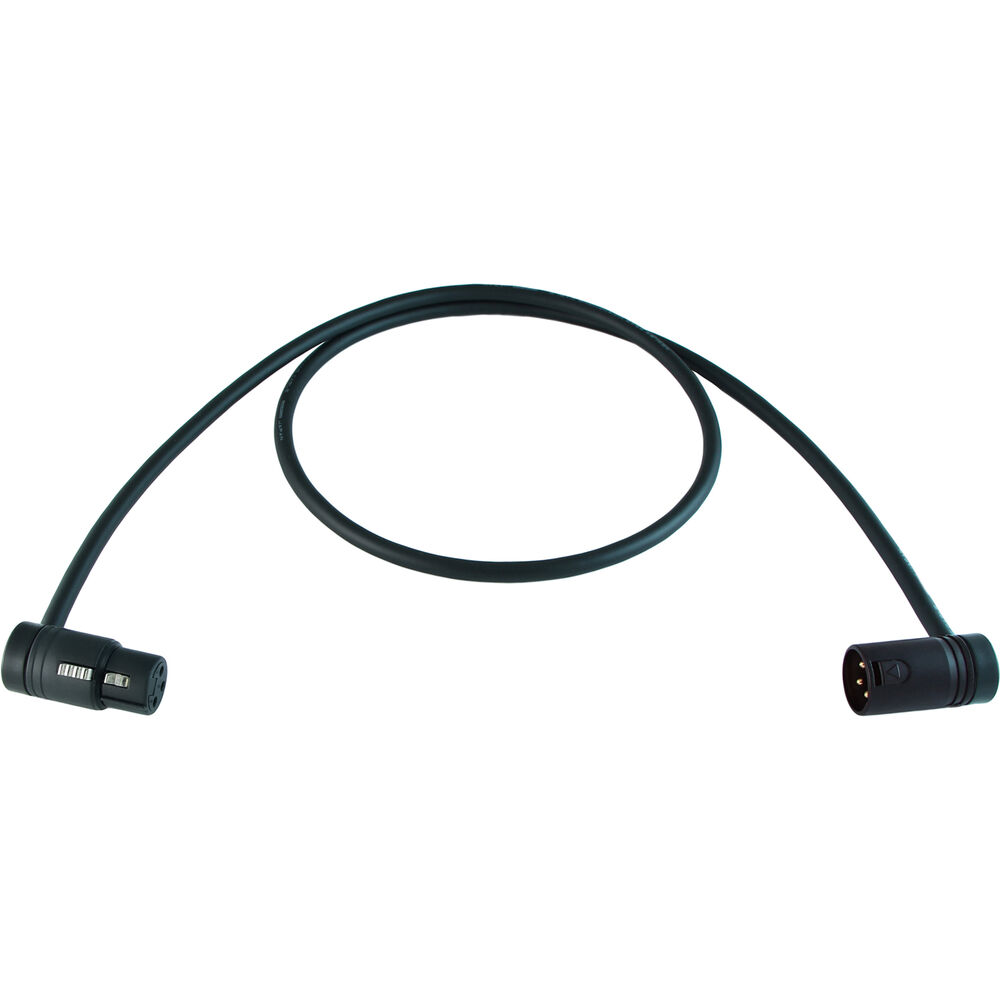 The 3' cable is terminated with a low-profile, right-angle XLR-3 female connector (with a black cap) at one end and a low-profile, right-angle XLR-3 male connector (with a black cap) at the other. You can adjust the low-profile XLR cable outlet orientation to fine-tune it to your exact needs with a 120° swing.