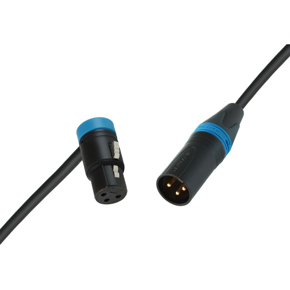The 3' cable is terminated with a low-profile, right-angle XLR-3 female connector (with a blue cap) at one end and a straight XLR-3 male Neutrik XX Series connector (with a blue ring) at the other. You can adjust the low-profile XLR cable outlet orientation to fine-tune it to your exact needs with a 120° swing.