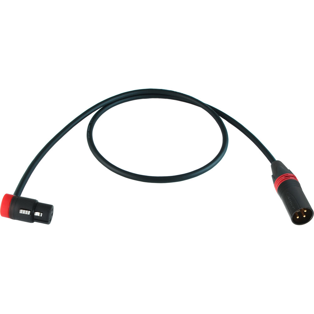 The 3' cable is terminated with a low-profile, right-angle XLR-3 female connector (with a red cap) at one end and a straight XLR-3 male Neutrik XX Series connector (with a red ring) at the other. You can adjust the low-profile XLR cable outlet orientation to fine-tune it to your exact needs with a 120° swing.