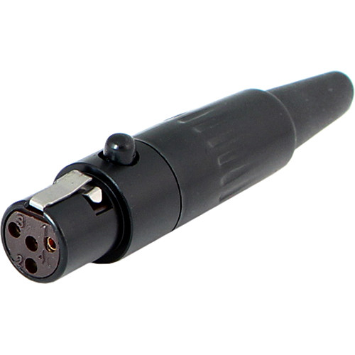 The black Cable Techniques TA4F 4-Pin Female Mini-XLR Connector is a TA4F connector designed to be attached to an interconnect cable for use with wireless microphones and power modules in ENG, field recording, and television production. It features a 4-pin female mini-XLR end with gold contacts and a standard cable outlet.