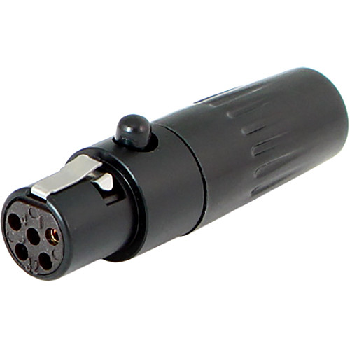 The black Cable Techniques TA5FL 5-Pin Female Mini-XLR Connector is a TA5F connector designed to be attached to an interconnect cable for use with portable mixers and recorders in ENG, field recording, and television production. It features a 5-pin female mini-XLR end with gold contacts and a 6mm cable outlet.