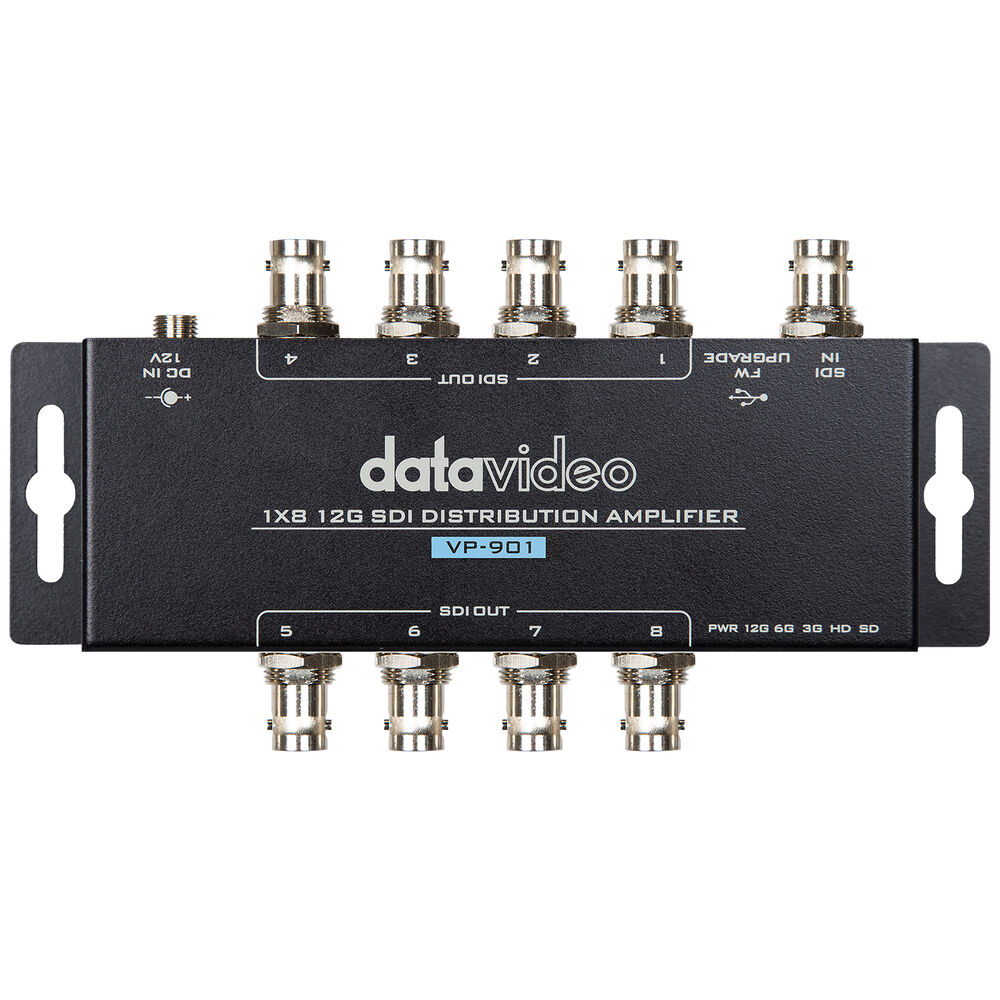 The VP-901 12G SDI Distribution Amplifier from Datavideo can distribute a single 12G, 4K, HD, or SD-SDI input into eight SDI outputs. It is a reliable video device, which splits an SDI, HD-SDI, 3G-SDI, 6G-SDI, or 12G-SDI video source to SDI compliant video displays simultaneously. It also supports re-clocking for a clean signal over long cable runs.