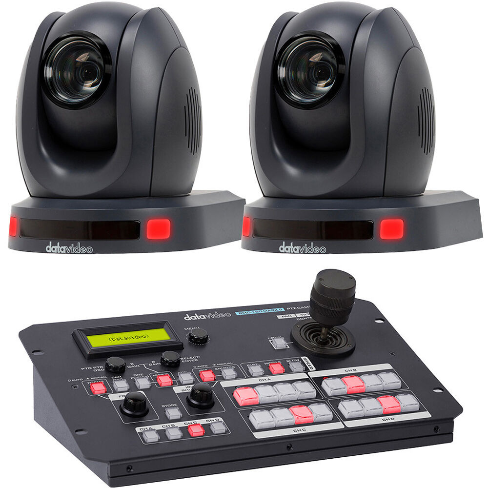 This black 2 x PTC-140 Camera Kit with RMC-180 Mark II Controller from Datavideo supports HD production and is an excellent choice for house of worship, education, and corporate work. The included controller supports up to four cameras, controlling their position and movement. The two included cameras support control via DVIP and VISCA/Pelco-P/D Serial Control, support RTSP and RTMP streaming protocols, and output HD video via HDMI or HD-SDI connectors.