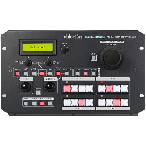 Use the Datavideo RMC-180 Mark II PTZ Camera Controller to adjust the focus, iris, zoom, and other settings of up to four PTZ cameras via RS-422 and VISCA protocols in live event or conference applications. One main joystick and various knobs and buttons allow for easy setup and control of connected cameras through four RJ45 inputs. Four shortcut keys per camera can be programmed into position presets for effects like close-ups and wide shots.