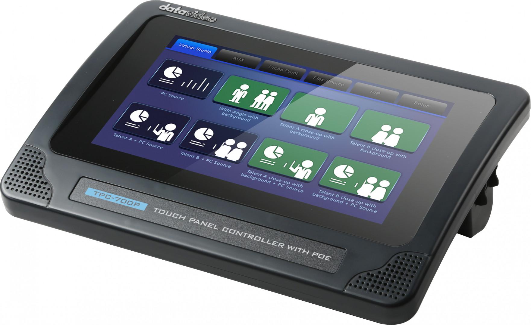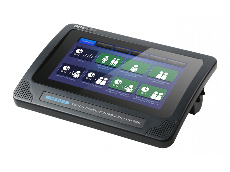 Datavideo TPC-700/TPC-700P is the best assistant for TVS-2000A Virtual Studio System. The TVS-2000A App that are installed on the TPC-700/TPC-700P contain presets of common operation functions. The interface is easy to use and can be controlled with a few finger taps on the 7-inch touchscreen to easily select different presets – multi- camera Virtual Studio switching, downstream key, and virtual studio presets. The Easy to live stream and record your virtual production show on the go
