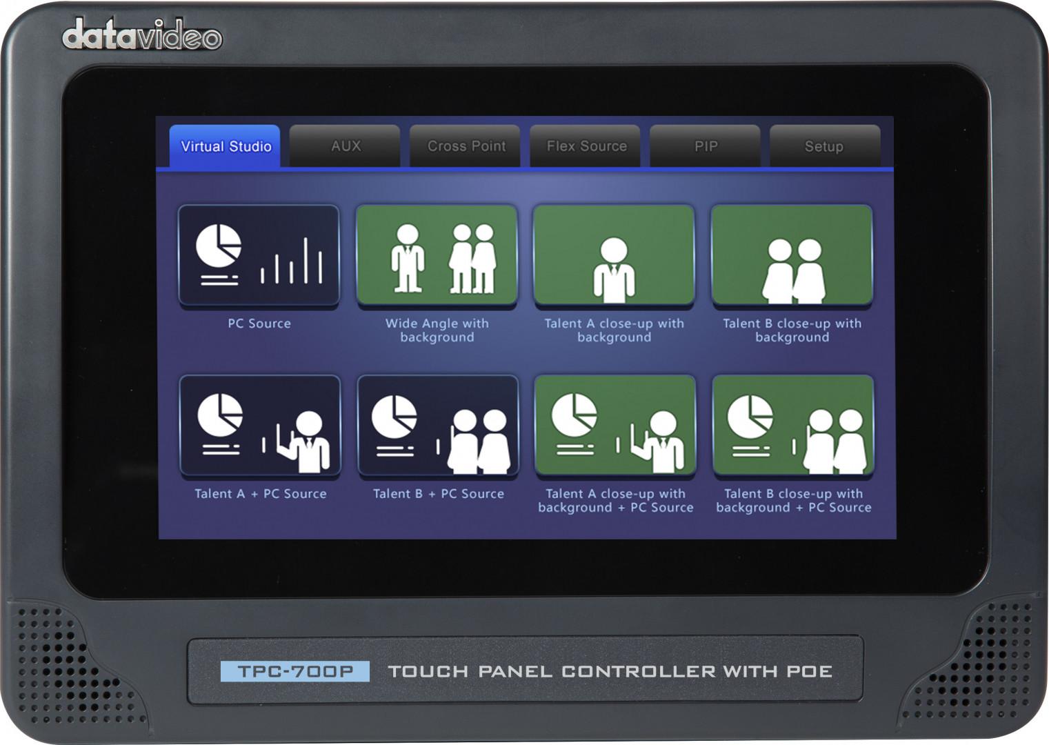 Datavideo TPC-700/TPC-700P allow user to install 4 virtual studios in the App. Just tap your desired virtual scene mode directly from the TPC-700/TPC- 700P for recalling the corresponding virtual scene.