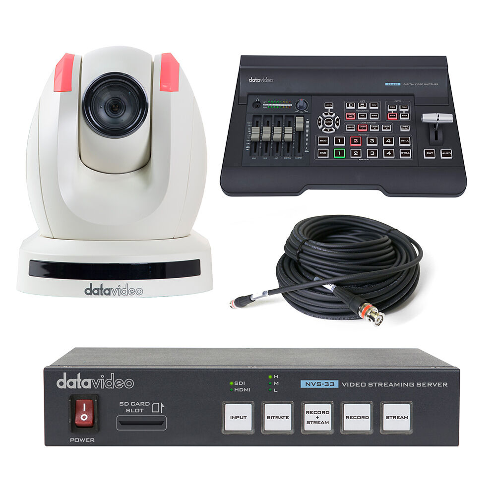 This white EZ Streaming Bundle B3 from Datavideo equips you with all the tech you need to record and stream 1080p HDMI/SDI video. It includes a white PTZ video camera, H.264 video streaming encoder and MP4 recorder, a 4-channel digital video switcher, and a 50' long male BNC to male BNC cable.