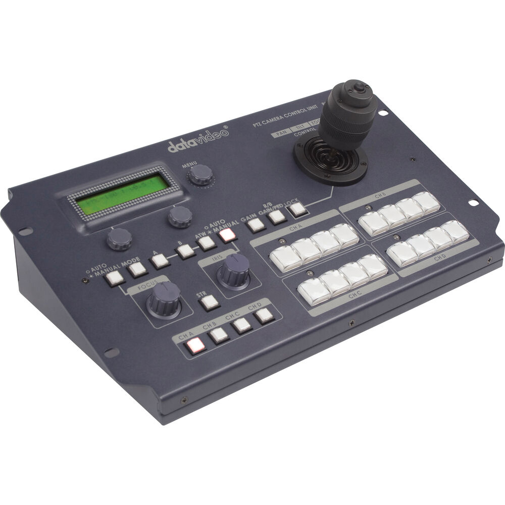 An ergonomic joystick and tactile button layout make for easy setup and control of up to four Datavideo PTZ cameras and robotic pan/tilt heads for any live production scenario.