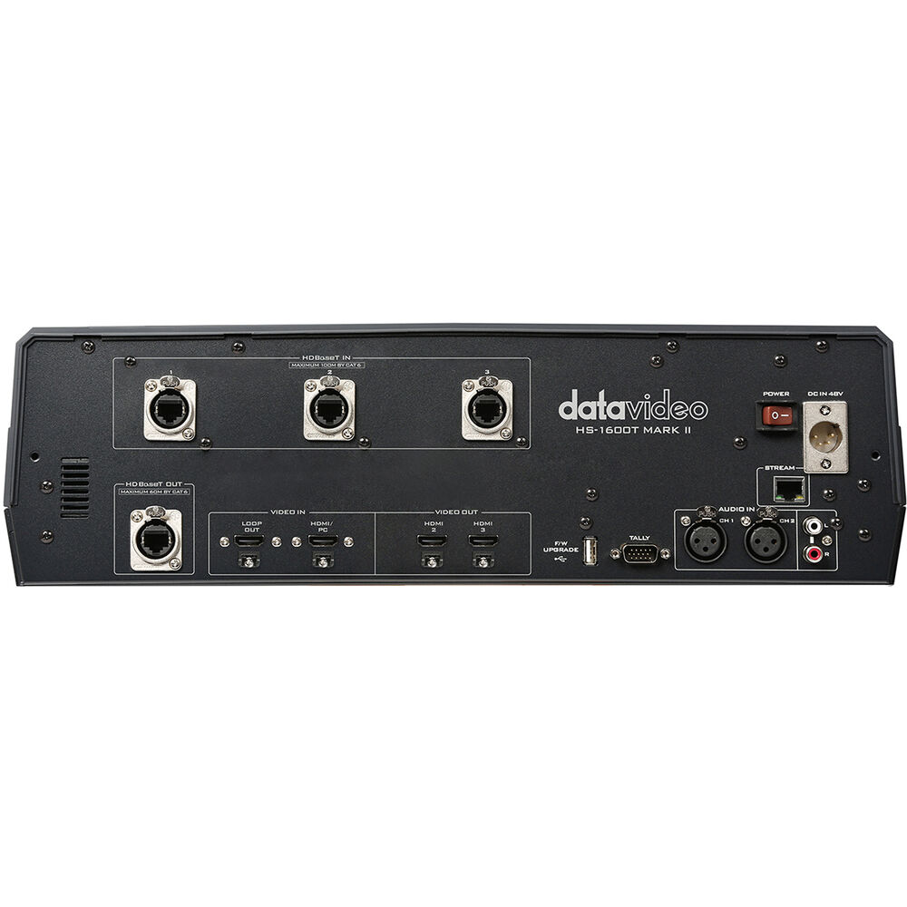 Bring your broadcast mobile with this HS-1600T Mark II 4-Channel HD/SD/HDBaseT Portable Video Streaming Studio from Datavideo. This mobile studio utilizes HDBaseT technology to control up to three Datavideo PTZ cameras while streaming H.264 video to the web. It features three HDBaseT inputs that can control connected cameras and accept video inputs, as well as one HDMI input to add an additional video source. Three HDMI program outputs allow you to connect to monitors to display your program, one HDMI is for graphics output, and a streaming RJ45 LAN output connector lets you stream live to the Internet using a minimum Cat 6 cable. Depending on the data rate of your stream, you can also record to an optional SD card.